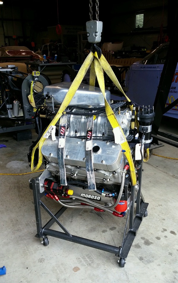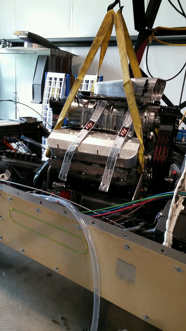 As you can see, here it is being lowered into the engine compartment. The bottom line is that it went in pretty smoothly. Mike only had to remove a couple of bolts to maneuver it into place. The silver straps are a safety requirement. They will hold down the blower should anything happen for it to lift off. Years ago we saw a drag car let loose a blower that landed in the grandstand and seriously hurt a spectator so we know it can happen.