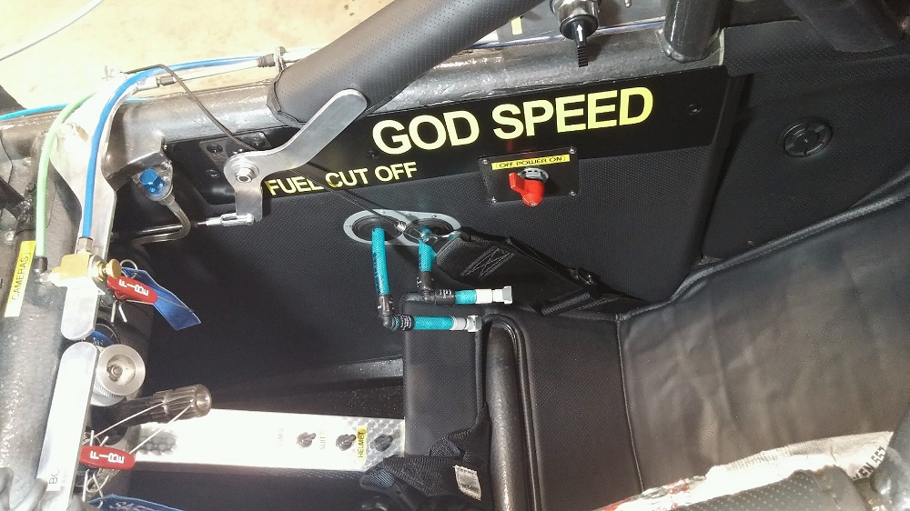 – Two blue hoses to the right of the driver’s waist connect to the Cool Shirt and circulate chilled water around the driver’s back and chest.