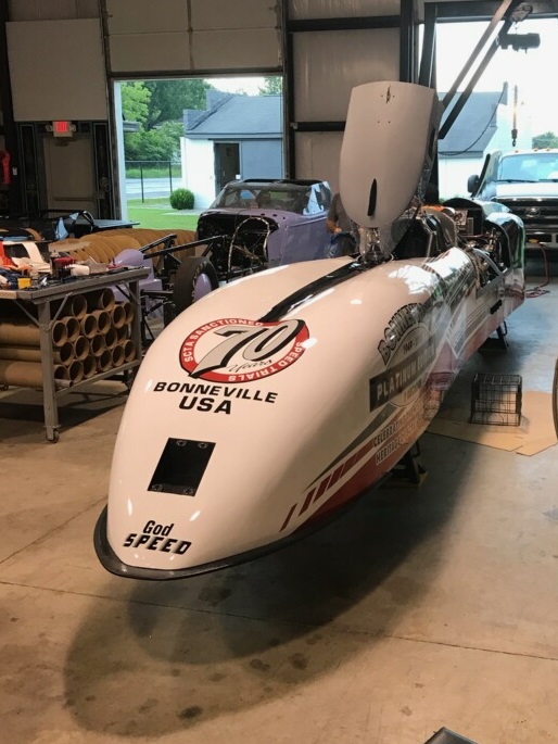 Now, drum roll please. Mike is on the way to Utah as of 3am this morning. The engine finally came to life yesterday afternoon. We spent Sunday chasing a major water leak before Mike Kopchik could spend meaningful time with Mike on cranking the engine. Adam and I both converged on the shop at about the same time and the engine had just fired up. We were excited to say the least. The whole trip had seemed to be in doubt for several days. This is not to say that everything from here out will go smoothly. The streamliner category is very complex. We could have difficulty getting through the “tech” inspection or could, at any point, have issues with the car that will put us out of the event. Many of the record holders worked for years to finally achieve a record. And most of them live on the west coast so have participated in the Speed Week and other annual events repeatedly. For now, we are excited to be able to make the trip.