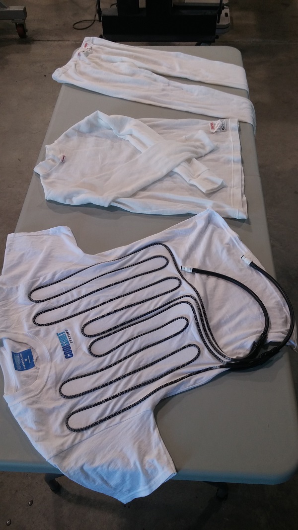 In the meantime I wanted to share some details on the wearable safety equipment. We have been accumulating these components for months now as they require a lot of research and are NOT inexpensive. Just like in other types of racing there are very strict rules on safety equipment. Every piece must be fire resistant and the end date on the tag must not be expired at the time used. For the Salt Flats in August we must be prepared for the heat that Mike will experience in the VERY HEAVY suit. We start with the undergarments. Mike will wear a CoolShirt with veins sewn in to be connected to a cold water tank in the car. One of my jobs will be to chill the water and fill and empty the water tank for each run. The fire retardant undergarments will go on top of the CoolShirt. I do not show them here but there will also be fire retardant socks.