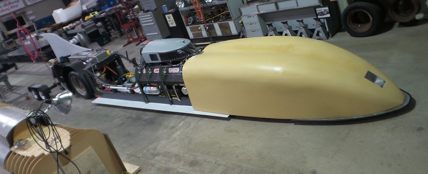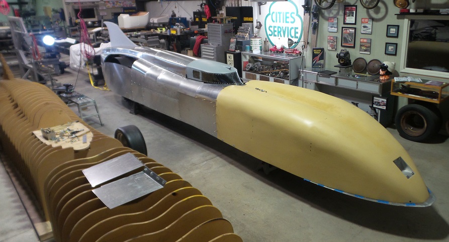 Yes, this is the year. This project has been in Mike’s mind most of his life and was actually started at least 10 years ago. We had returned home from competing with the ’34 Ford roadster at the Salt Flats and Mike began thinking about stepping up to a streamliner. He put together a couple of rough sketches and presented to his artist friend, Jim Norris. Mike asked Jim to draw up some more professional renderings. As the story goes, instead Jim insisted that we provide him with a block of balsa wood. The ultra-talented Jim carved and painted a scale model of the streamliner.