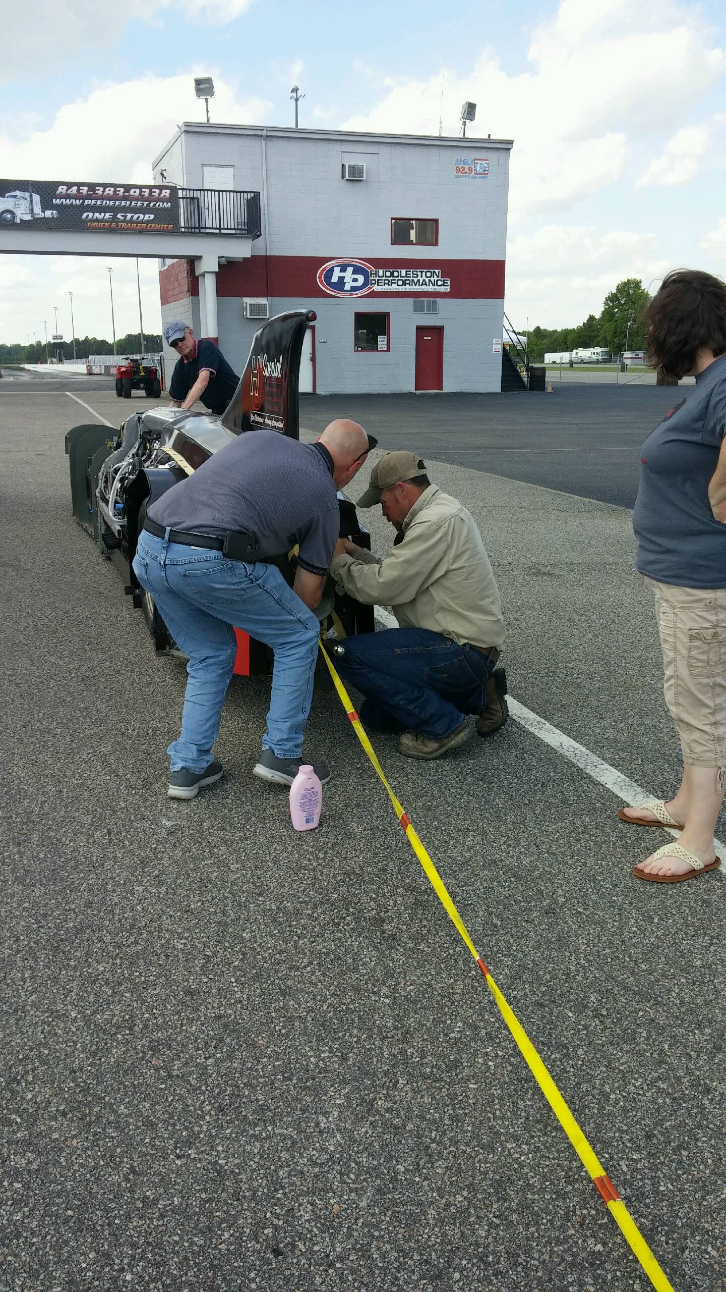 With the auto shows completed, the next thing on the list with the streamliner was to test it at our local dragstrip, the Darlington Dragway. Toward that end, Mike began the task of checking out different components on the car and making a few minor tweaks. Once that was done Adam, Mike, the kids and I gathered at the shop one afternoon to crank the motor. Mike wanted to actually put the car in gear and move it forward ever so slightly. That is tricky for such a powerful motor and in such a confined area. Mike had cleared a path the length of the building on one side for this purpose. (I was much more nervous about attempting this than I should have been but everything went fine and the car did NOT shoot out of the building into the back of the trailer at the other end.) One fact revealed to Mike during this test was that the manual steering needed to be replaced with a power steering system to ensure that he can maneuver the car in an emergency.