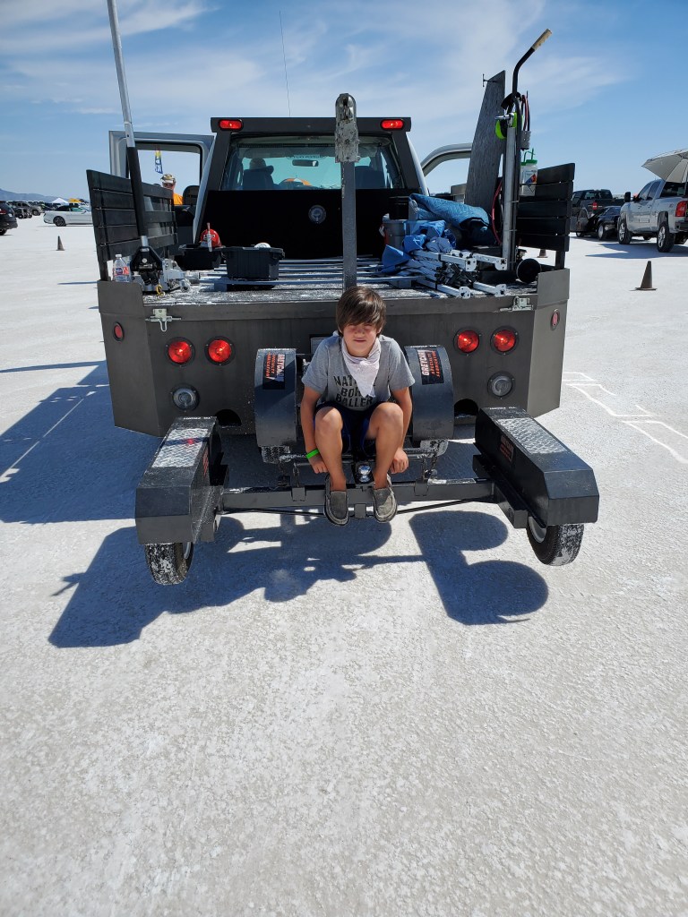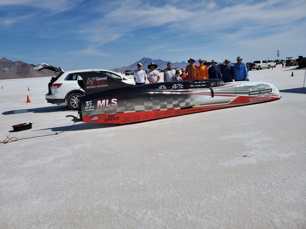 When it was finally our turn the guys cranked the car and jumped into Mike’s truck and the other crew vehicle. John has taken on the task of pushing the car out since Marshall is not with us. We did not have to push him but a short way before he accelerated and we veered off to the left. The car wiggled a bit on the course which concerned us. Driving a vehicle on the salt is quite tricky. It can be likened to driving on a snow-covered road. You just have to coax the car to continue going straight with your steering and not use the brakes. Mike was able to steer through and made it all the way down the course. By the time we picked him up on the other end we had heard on the CB radio that he had topped out at 191 mph. We were excited but didn’t know if he might be penalized in some way because he was only supposed to go 175 mph. However, Lee Kennedy beat us to the car and pushed it off the track. Nothing was said about him going faster than the officials had dictated.
