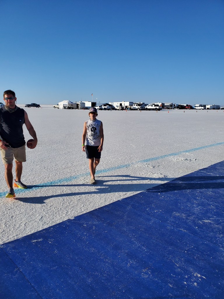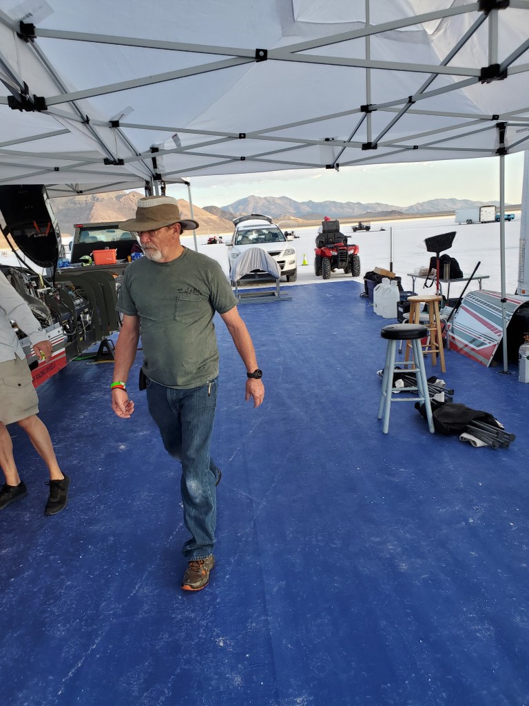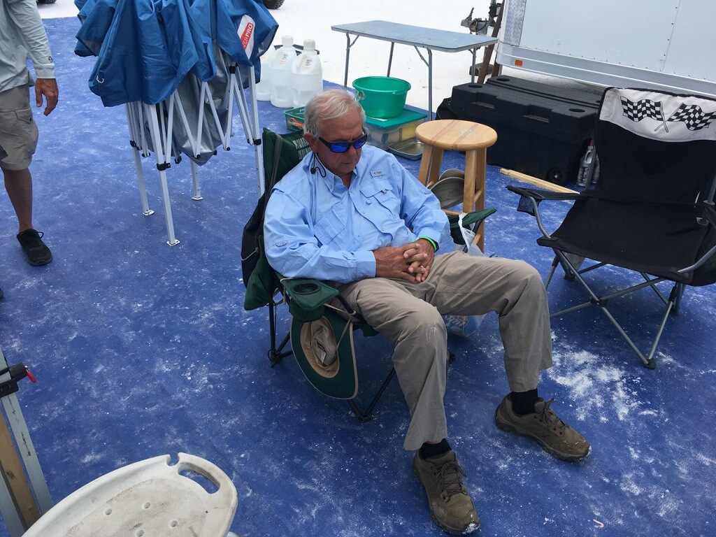 We generally have two rental cars (which cannot be driven on the salt), Mike’s truck and any other vehicle willingly subjected to the harsh effects of the salt. We park the rental cars somewhere along the access road and everyone piles into the other vehicles. This year we had Mike’s truck, Louis’ truck and Louie’s (wife’s) SUV. Apparently Louie’s wife saw a photo of her SUV being used as a chase car for the streamliner somewhere along the line and she was not happy. Sorry, Marie! However, I understand Louie promised to clean it up good as new.